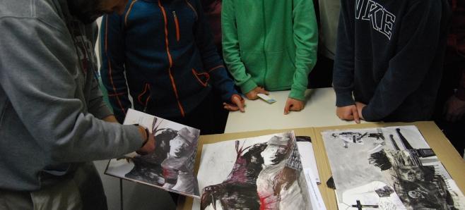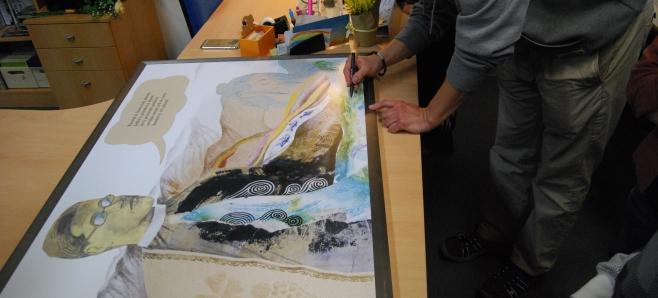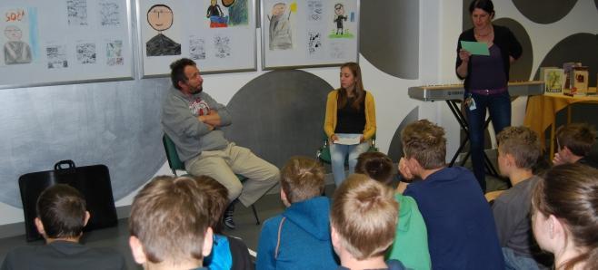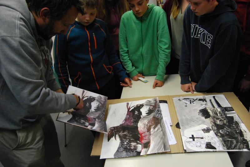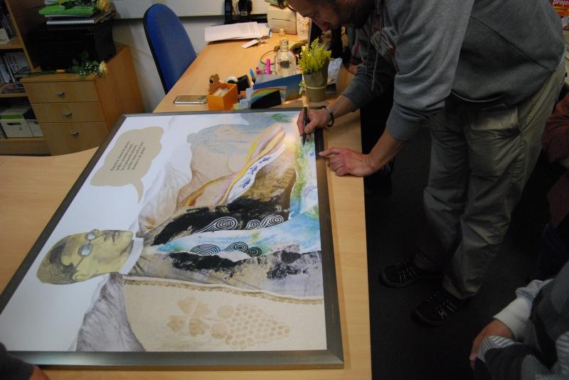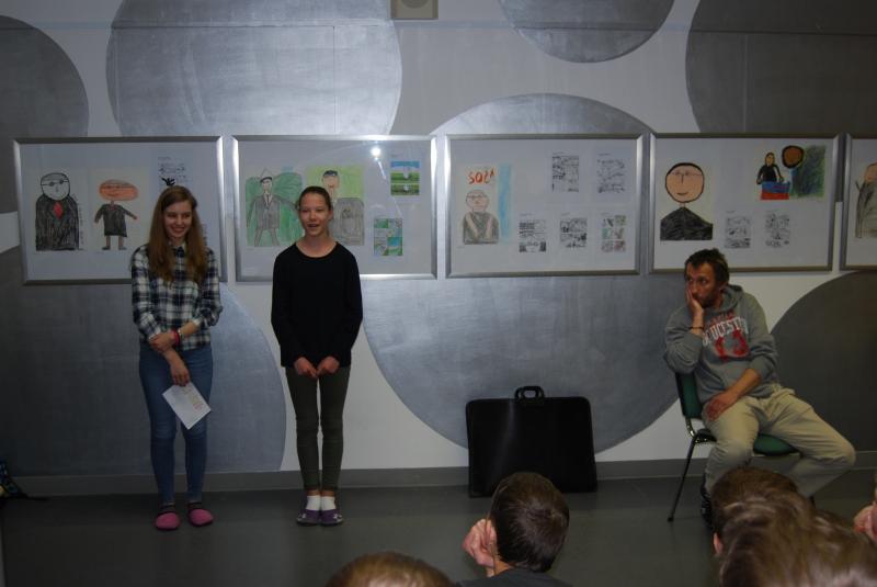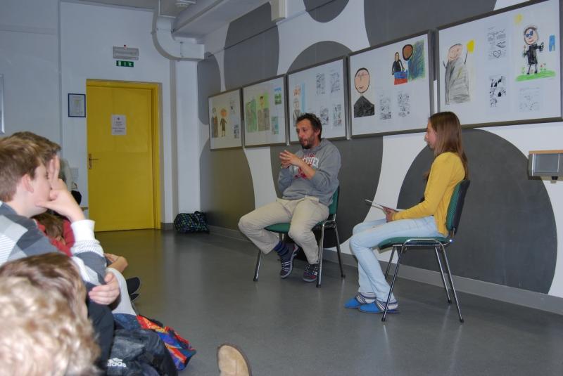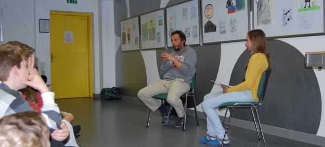 Šolska knjižnica je bila v četrtek, 11. maja, likovno obarvana. Z obiskom nas je v sklopu festivala Bralnice pod slamnikom razveselil priznani ilustrator Damijan Stepančič. Učenci 8. in 9. razreda so spoznali njegovi slikanici Anton in Arsenije!, ki smo ju tematsko povezali še s slikanico Soči, avtorja Simona Gregorčiča. V vseh treh slikanicah se srečamo z motivi 1. svetovne vojne, ki je zaznamovala tudi naše domače kraje. Šolska likovnica Petra Škrjanc je postavila razstavo stripovskih mojstrovin 8. razreda na temo pesmi Soči, 2. razred pa je dodal portrete Simona Gregorčiča. Veliko zanimivosti o življenju in delu ilustratorja Damijana Stepančiča ter tudi njegove vzpodbudne misli za učence smo slišali skozi odgovore intervjuja, ki ga je vodila učenka 8. razreda. Na prijetno druženje z ilustratorjem pa nas bo spominjal njegov avtogram na reprodukciji ilustracije iz pesmi Soči, ki bo krasila steno šolske knjižnice.