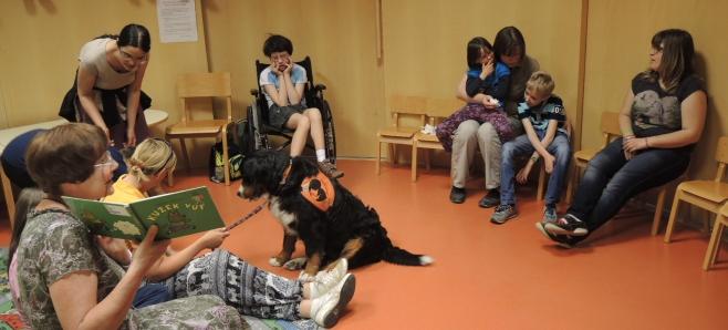 V okviru mladinskega literarnega festivala Bralnice pod slamnikom so nas v sredo, 13. maja 2015 obiskali otroci iz Osnovne šole Roje. Prišli so na bralne urice s psičko Išo in prostovoljko Ireno, ki deluje v okviru društva Ambasadorji nasmeha.
