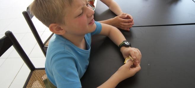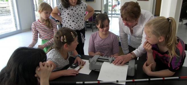 V prvi skupini so učenci preizkusili nekaj pripomočkov, ki jih uporabljajo slepi, ter si na posebnem pisalnem stroju napisali svoje ime v Braillovi pisavi.