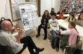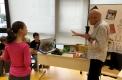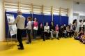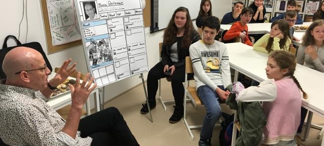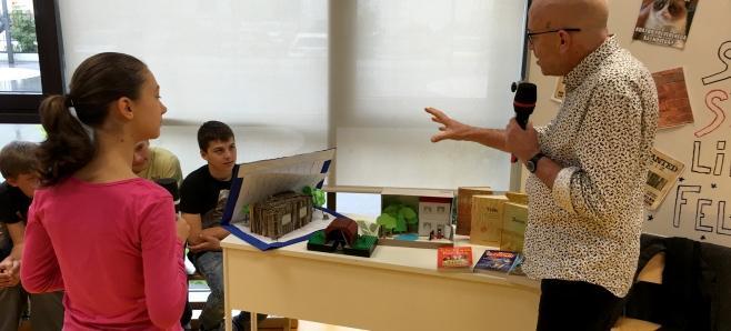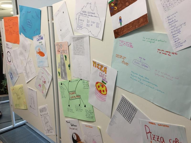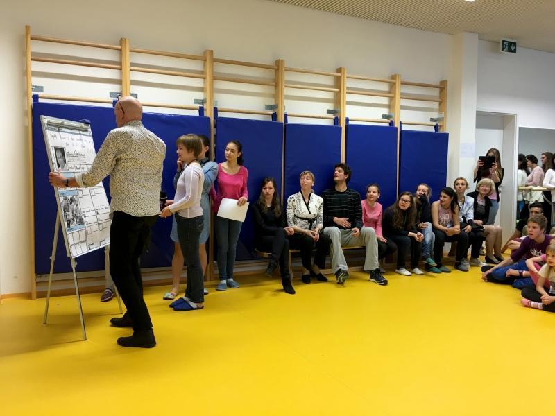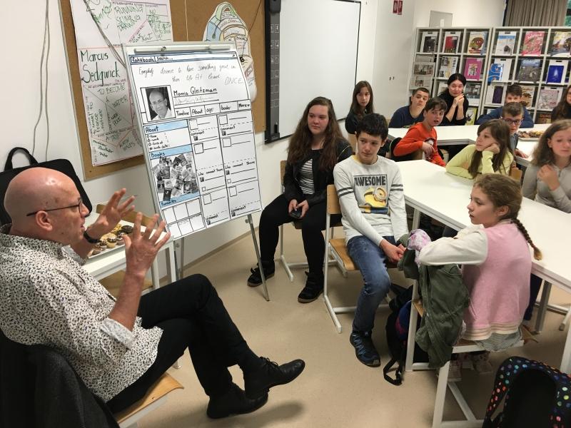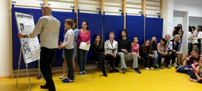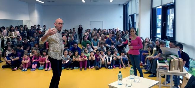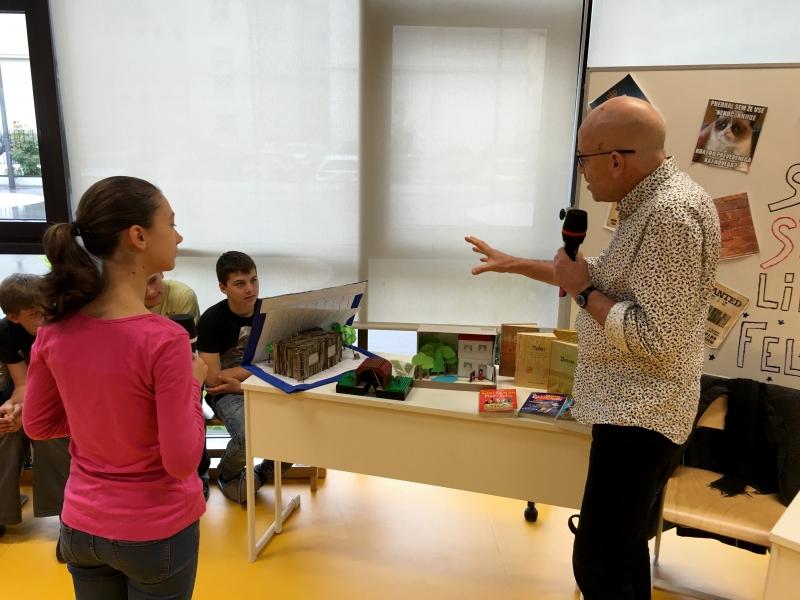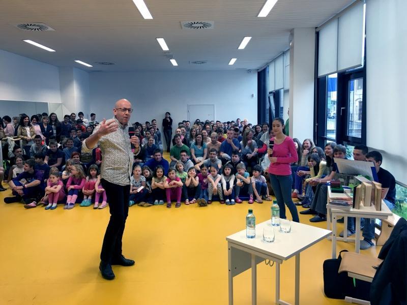 Pisatelja so učenci najprej presenetili z domiselno izdelanimi maketami, ki so ponazarjale določene odlomke iz njegovih knjig. Vse štiri Gleitzmanove knjige, ki so do zdaj izšle v Sloveniji pri naši založbi – Nekoč, Potem, Zdaj in Tedaj – so učenci pred njegovim prihodom, seveda, vestno prebrali. Pisatelj se je v njihovem kvizu odlično odrezal, prav tako odlični pa so bili kasneje tudi učenci, ki so pisatelju postavljali številna zanimiva vprašanja o njegovem delu pa tudi o njegovem življenju. Že tako zanimiv in barvit program so okronali še pevski nastopi učiteljev, plesni nastop učenk ter zares ganljiva (plesna) točka učencev s prilagojenim programom. Za piko na i so kasneje prišli na svoj račun še učenci, ki obiskujejo knjižnični krožek, saj so ti še dodatno poklepetali z Morrisom Gleitzmanom in izvedeli še nekaj dodatnih zanimivosti iz njegovega življenja.