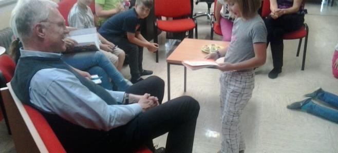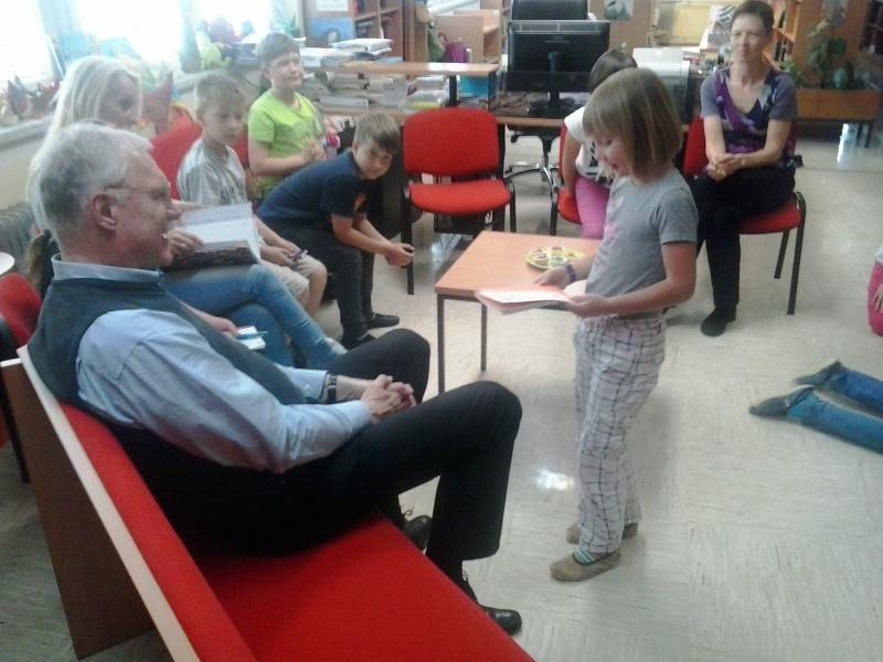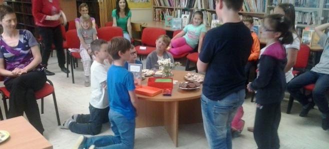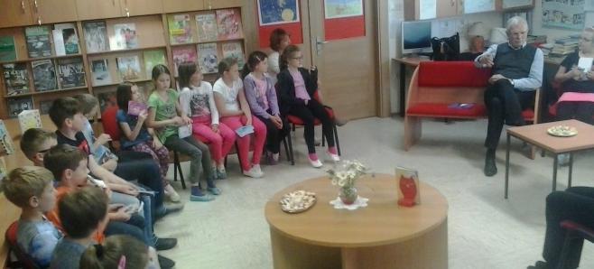V ponedeljek, 18. maja, je Slavko Pregl obiskal OŠ Rodica. Srečanje okoli mize, ki se je na koncu šolske ure napolnila z vsemi dobrotami, ki si jih Ela želi v svoji slaščičarni, je napolnila trebuhe vsem prisotnim. Otroci so z nasmeškom na obrazu poslušali duhovite odgovore na vprašanja, ki so jih postavljali pisatelju, na koncu pa je sledilo še presenečenje ... Odigran prizor iz Preglove Slaščičarne pri veseli Eli, s katerim je zadišala knjižnica, saj so čokolada in piškoti, ki so jih spekli učenci sami, zadišali še daleč naokrog ...