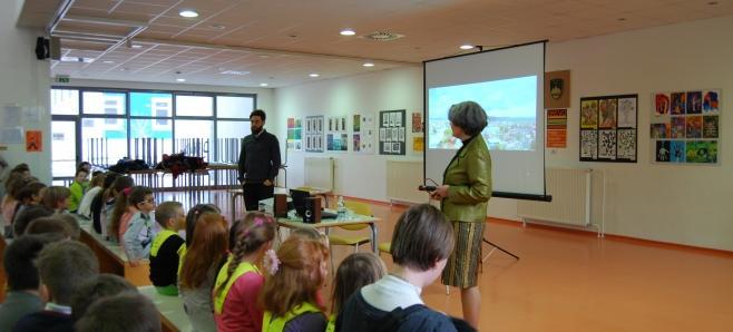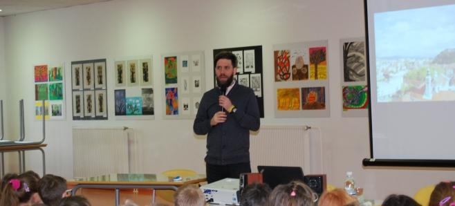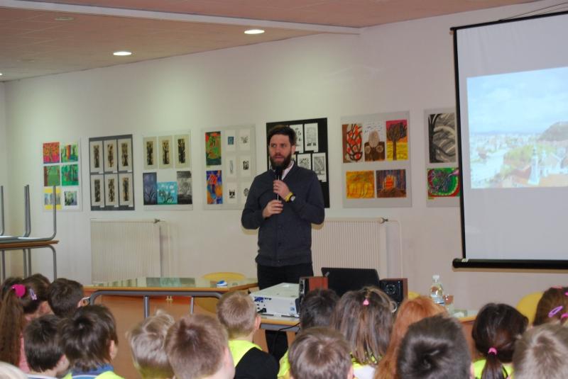 Učencem prvega in drugega triletja je pripovedoval o svoji prvi knjigi Jastrebov let. Pripoved je bila za učence zanimiva, zato so pritrdilno odgovorili na vprašanje: »Ali imamo čas še za eno zgodbo?« Pisatelj je predstavil še deklico Živo, ki v knjižni zbirki Živa iz muzeja predstavlja predmete iz slovenske zgodovine, ki jih hrani narodni muzej Slovenije. Učenci so spoznali viteza Gašperja in viteško življenje.