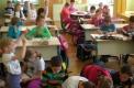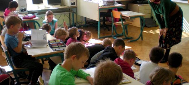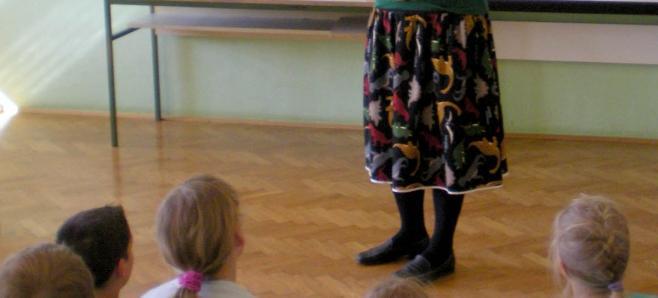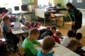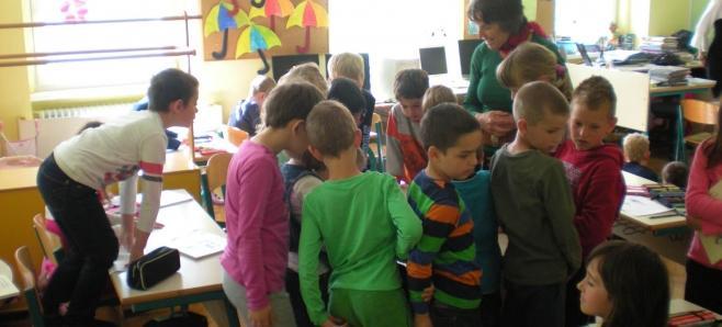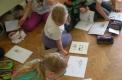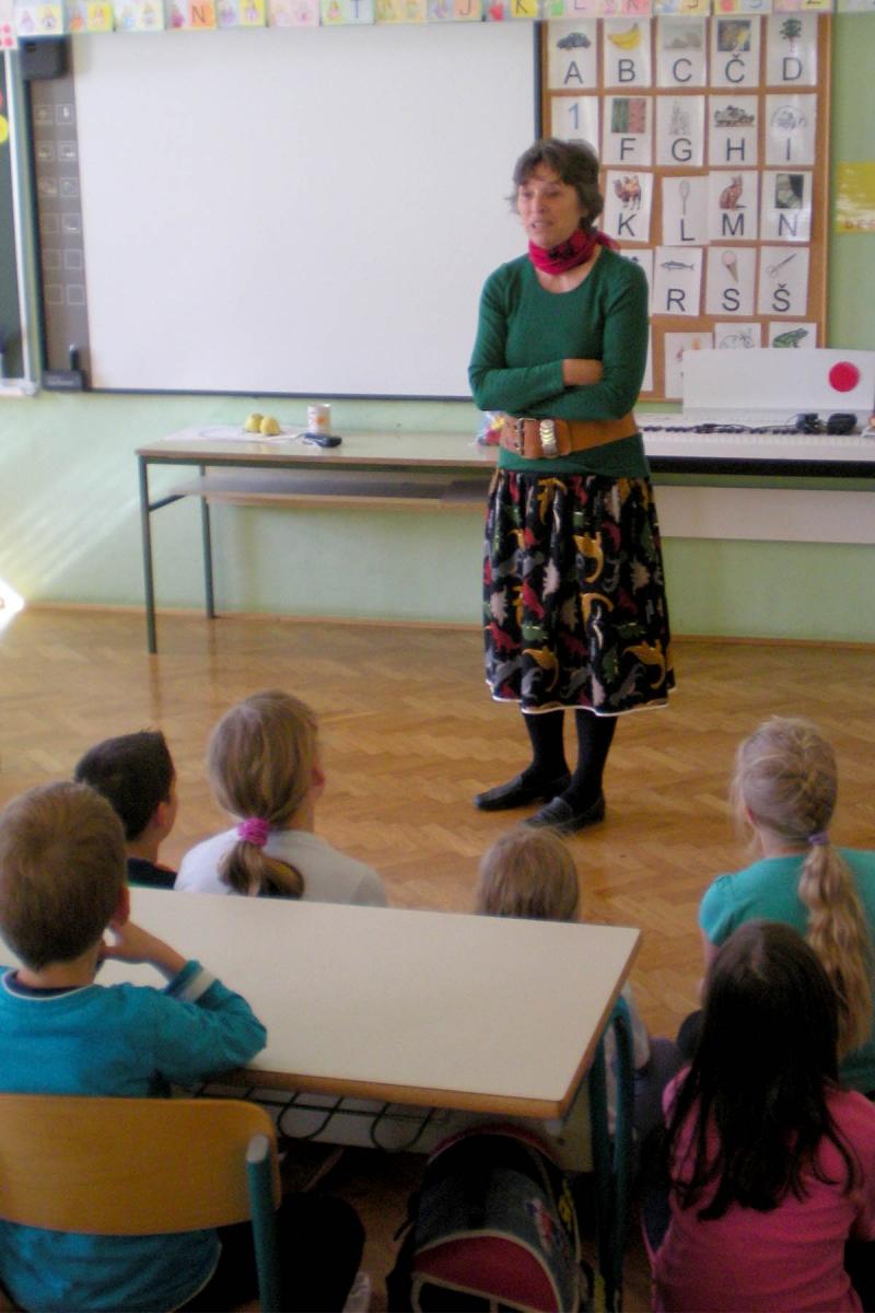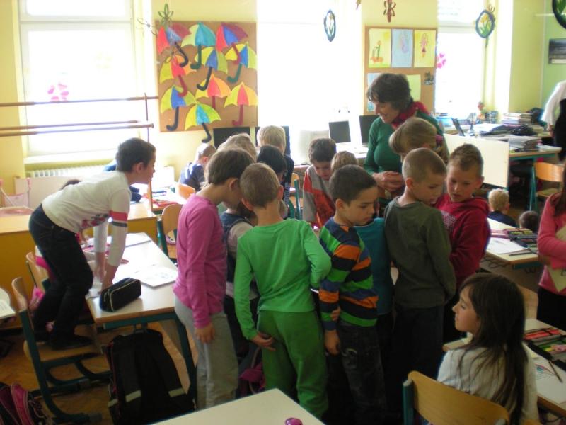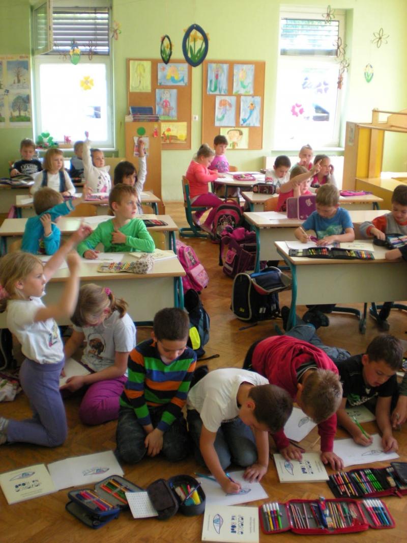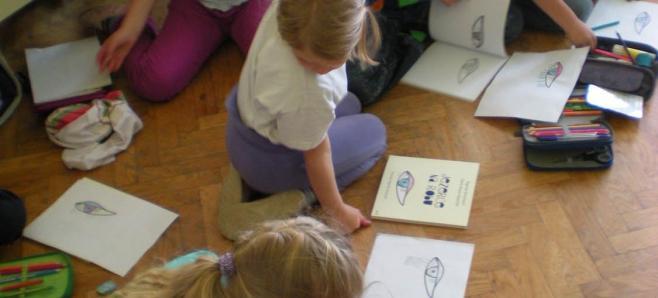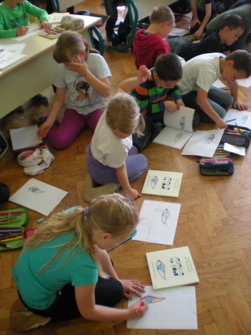 Učenci podružnične šole Zgornji Tuhinj so likovno ustvarjali s pisateljico Ifigenijo Simonović na temo njene pravljice Jezerce na robu.